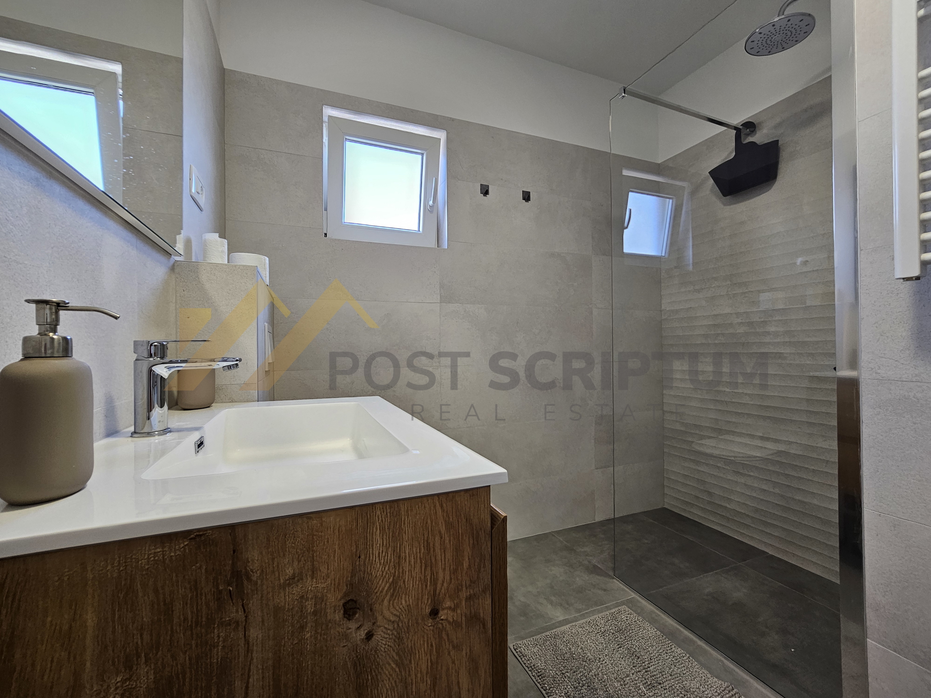 It consists of entrance area, kitchen with dining room and living room, two bedrooms, bathroom, storage room, balcony, terrace that extends along the entire south side and 25sqm lawn.