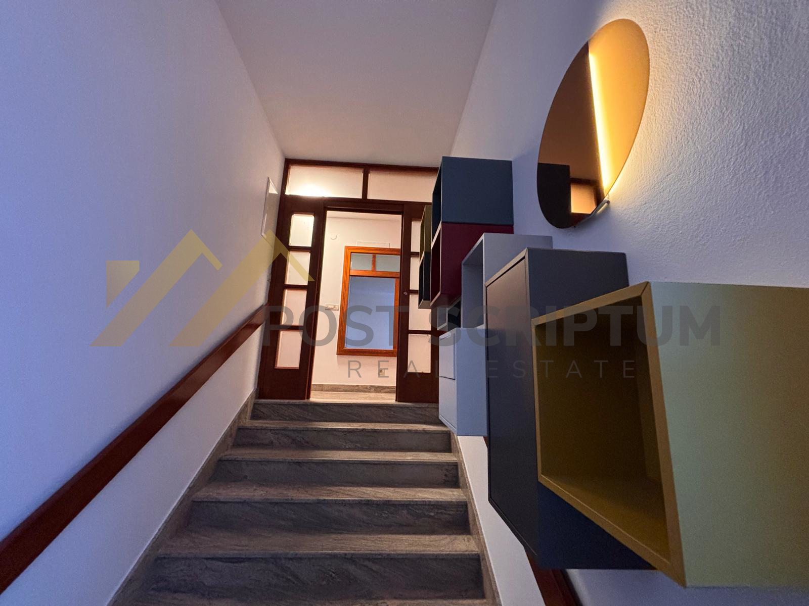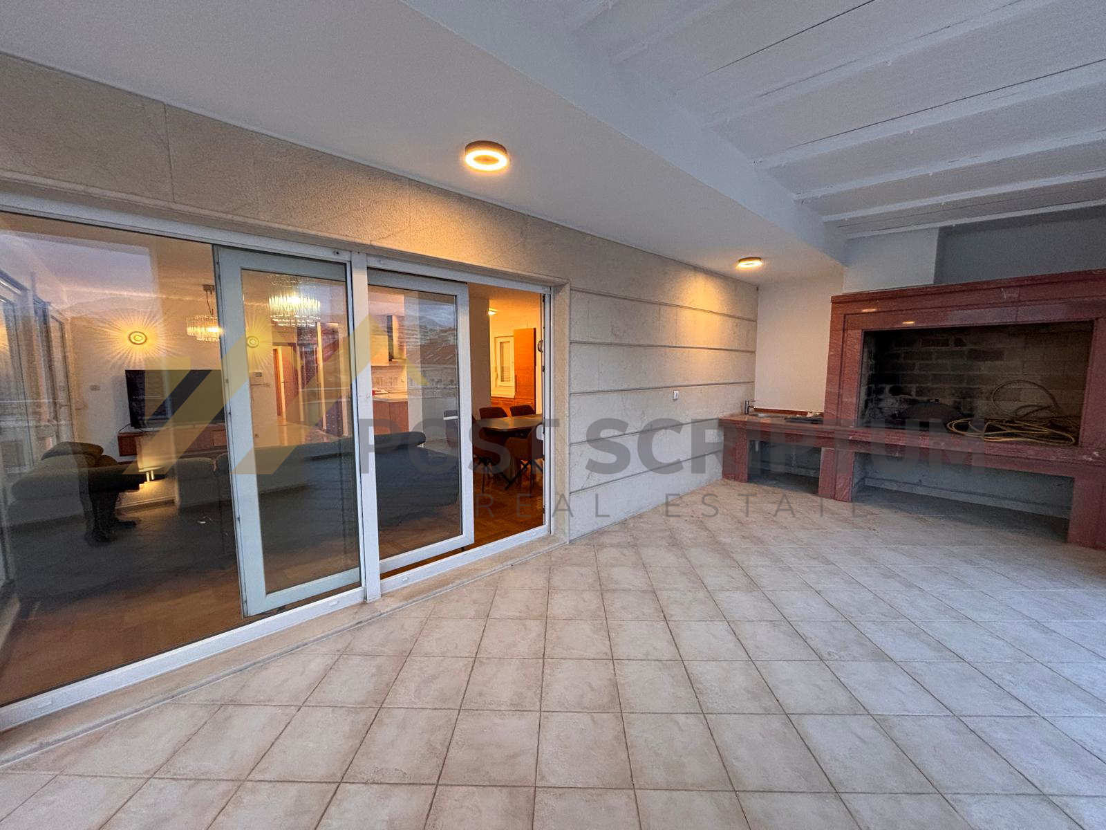 Sastoji se od ulaznog dijela iz kojeg vode mramorne stepenice do samog stana, kuhinje, blagovaonice, velikog dnevnog boravka cijelog ostakljenog s izlazom na terasu, tri spavaće sobe (jedna soba s garderobom), dvije kupaonice, terase i garaže.