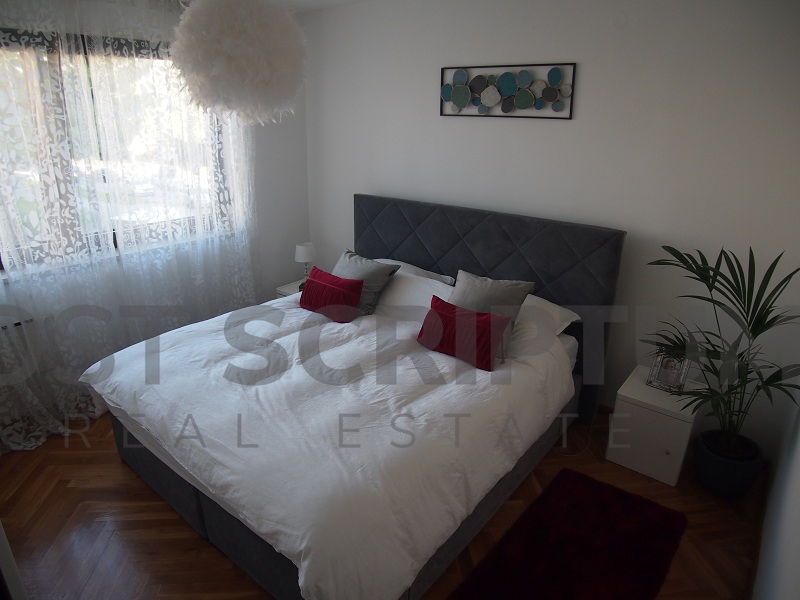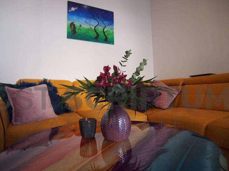 Opremljen je svim potrebnim namještajem i uređajima (TV, perilica rublja, perilica posuđa, dva klima uređaja).